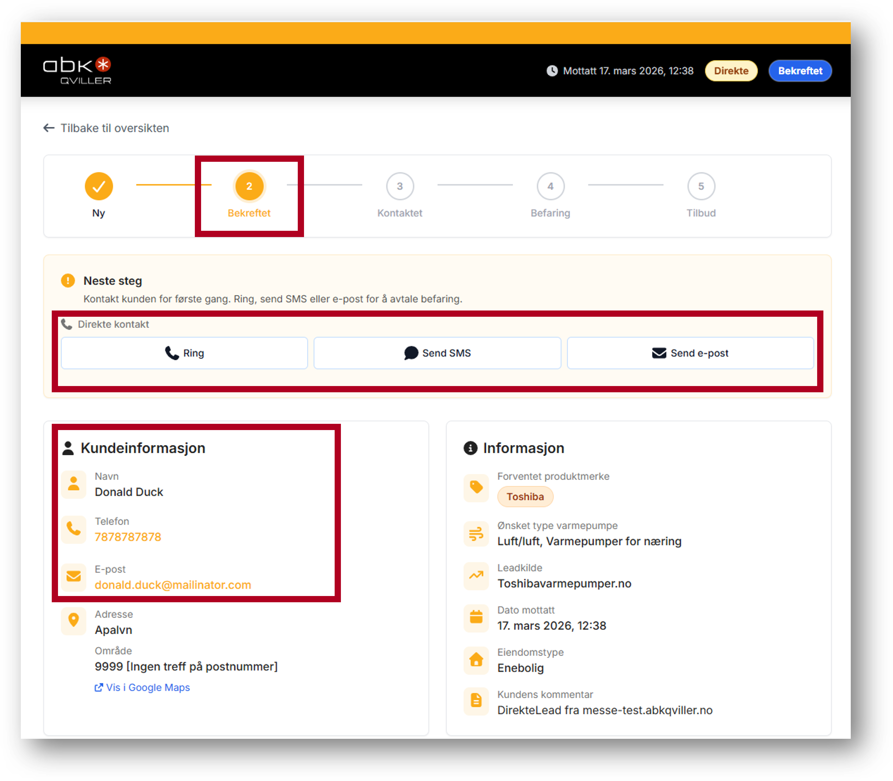 - Kontaktopplysninger vises i seksjonen "Kundeinformasjon"
