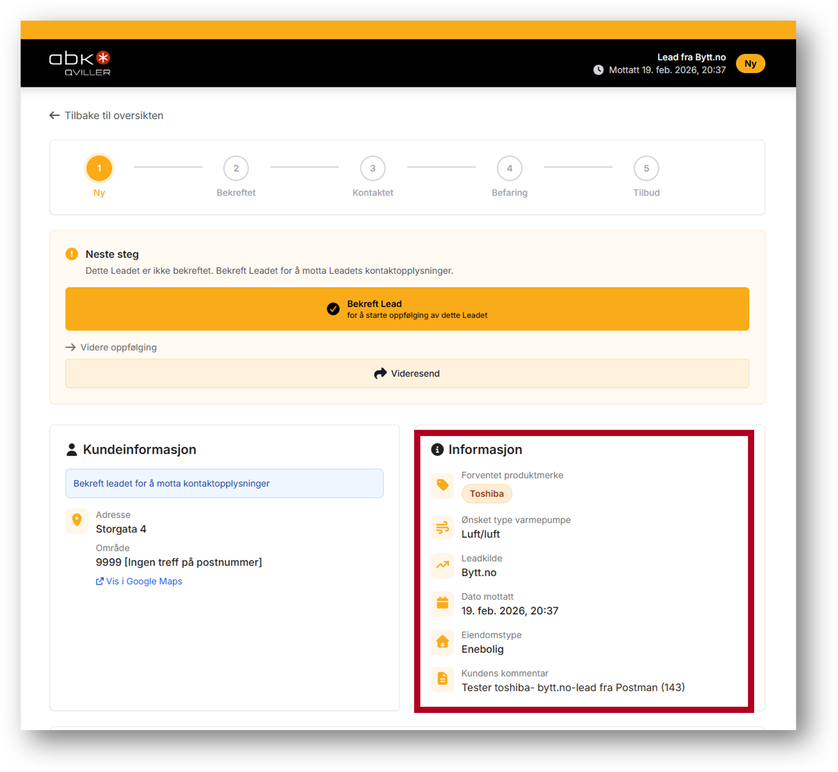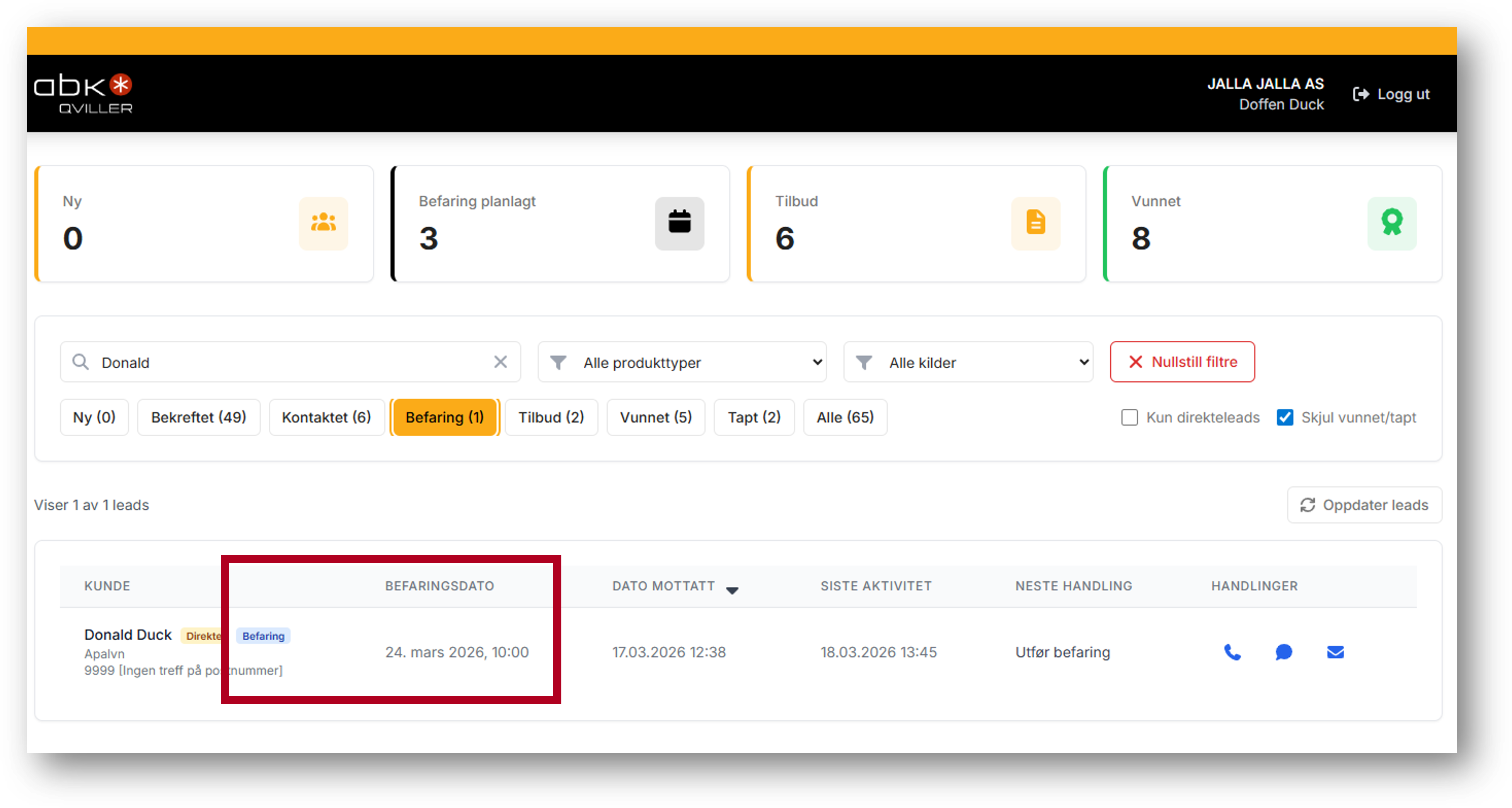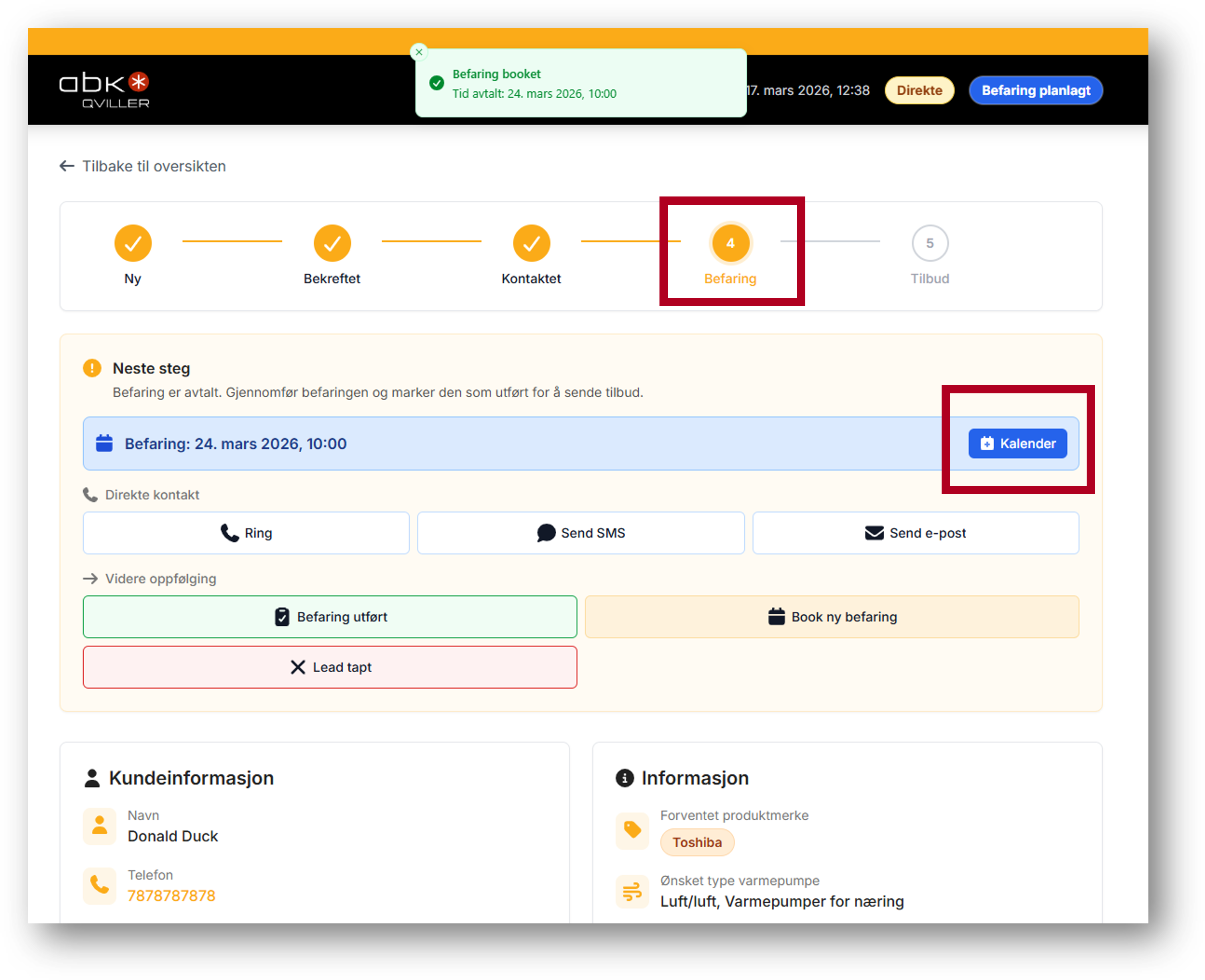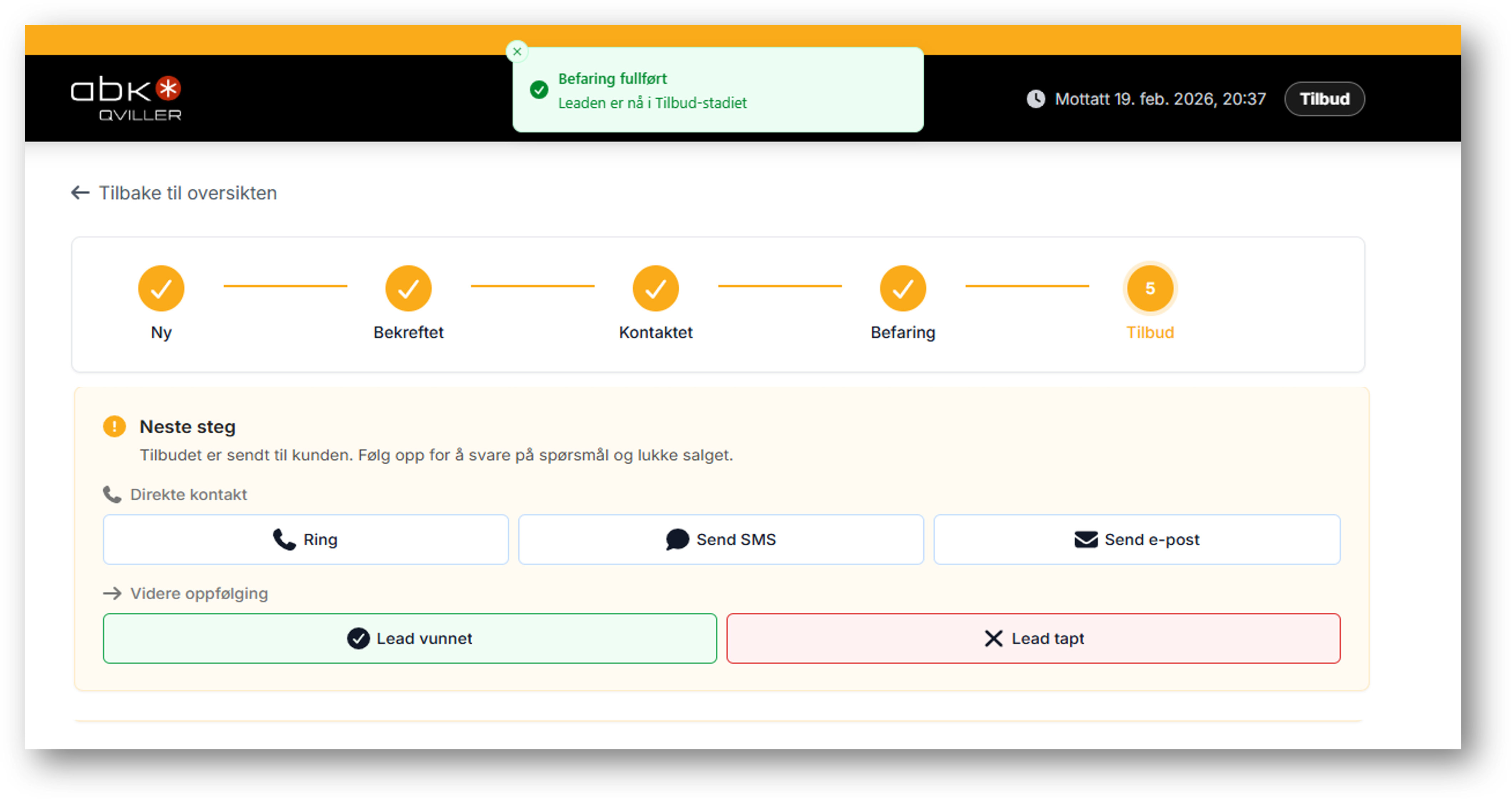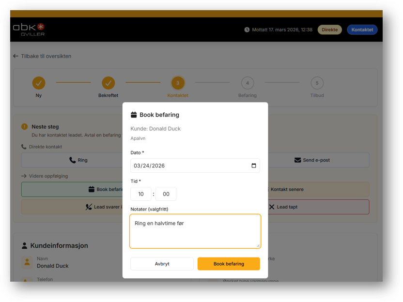 - Leadet blir tagget med "Befaring" i Leadsoversikten