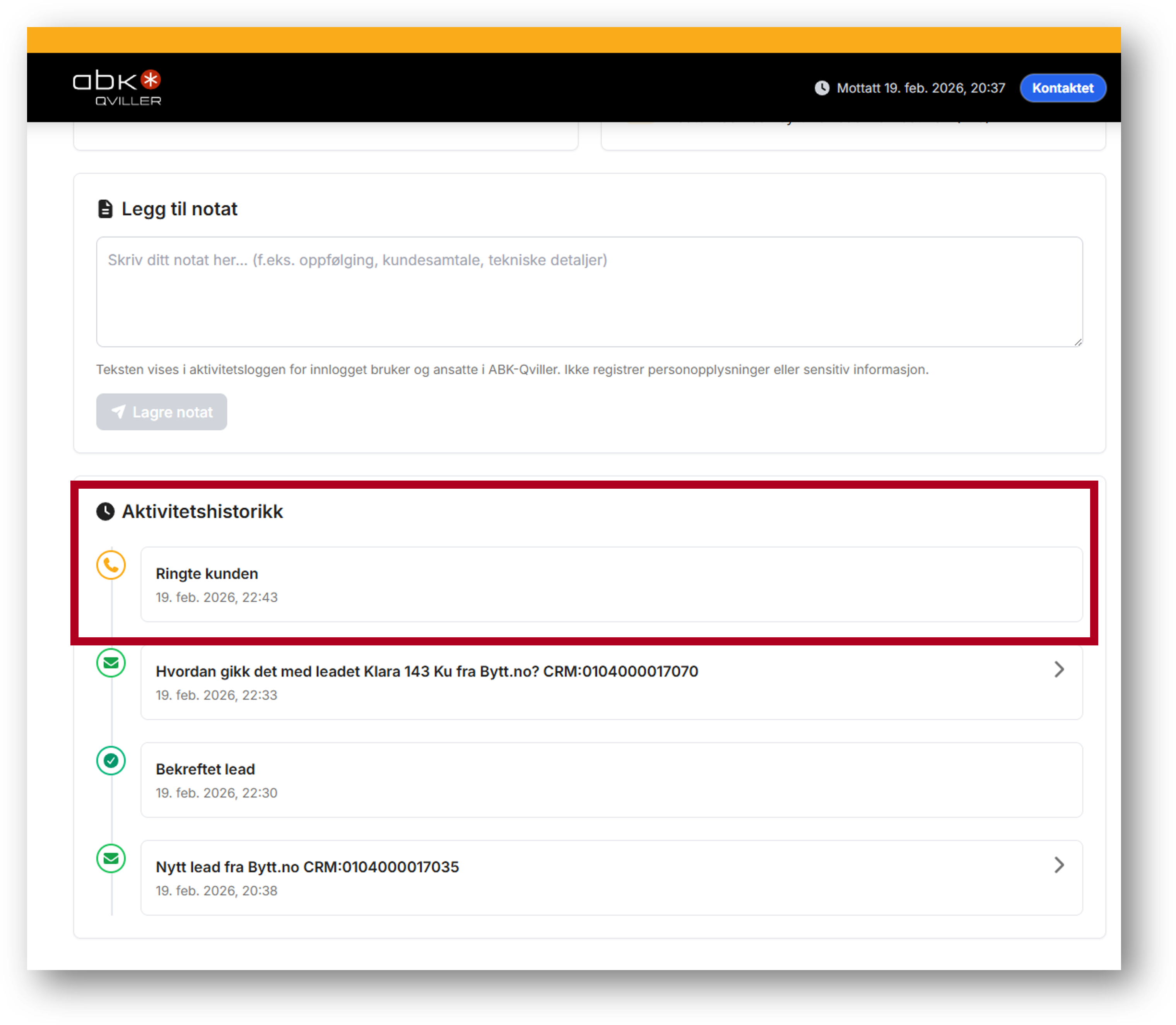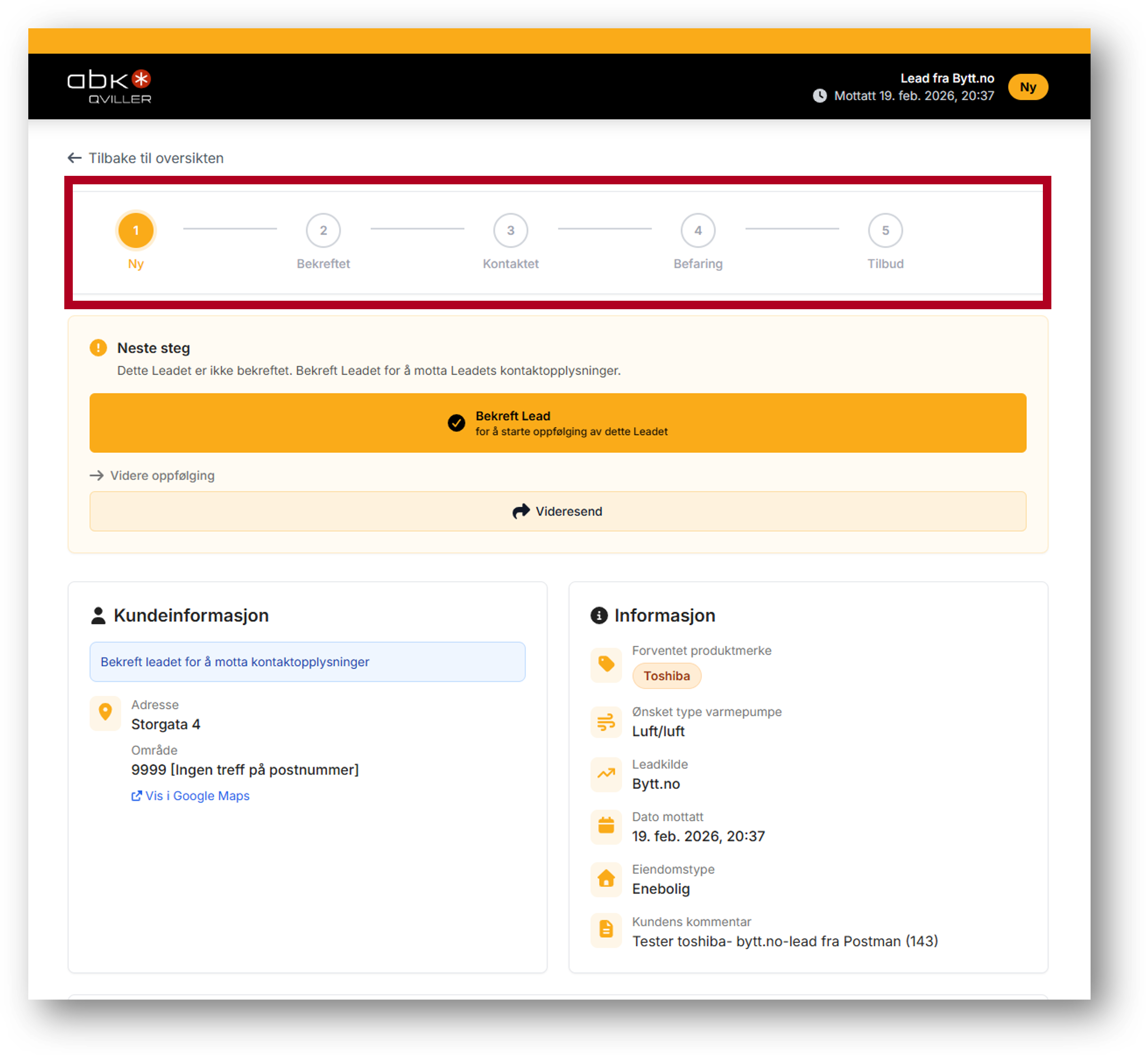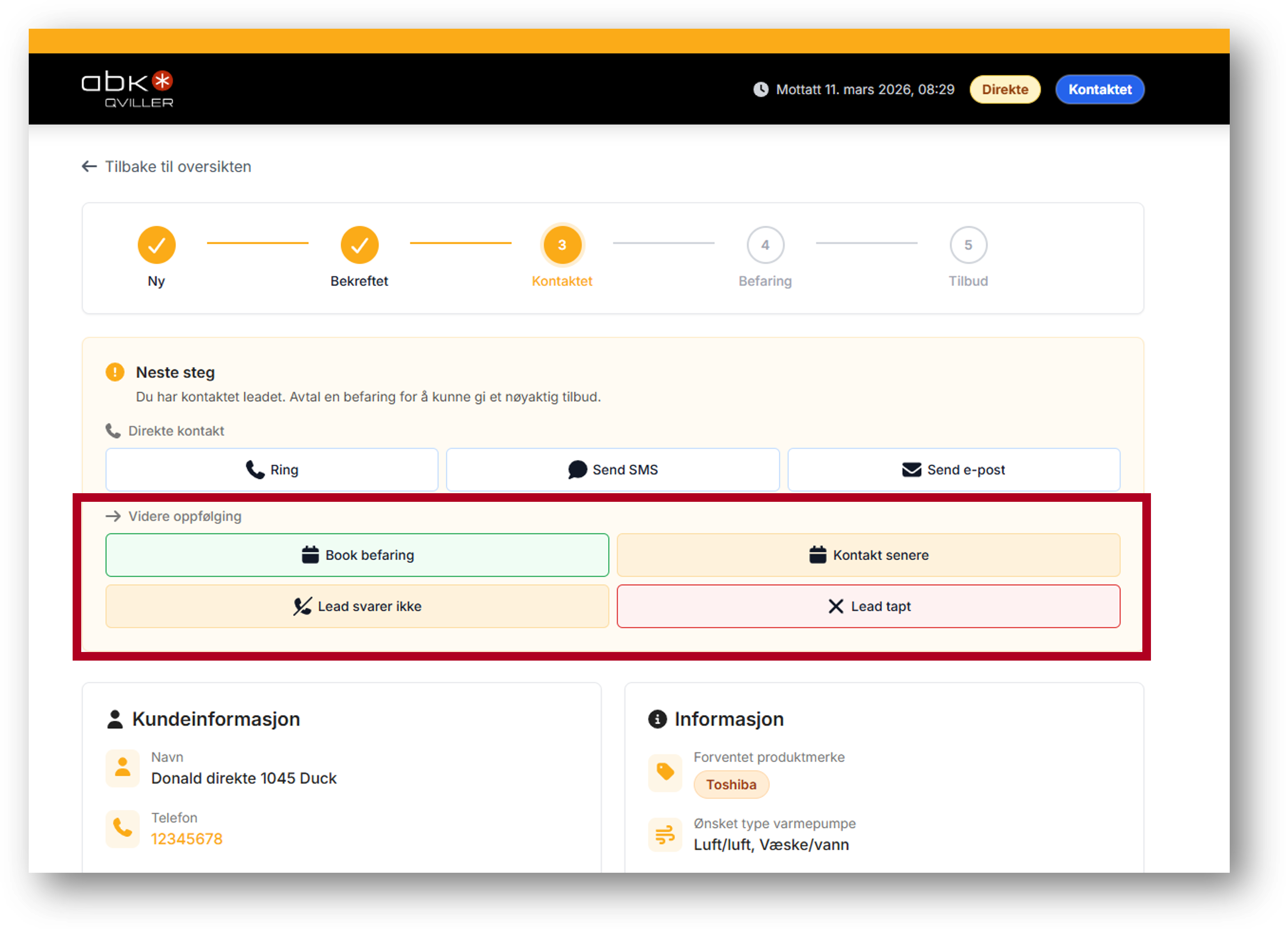 Øverst på Leadet kan du se hvor du er i salgsprosessen.