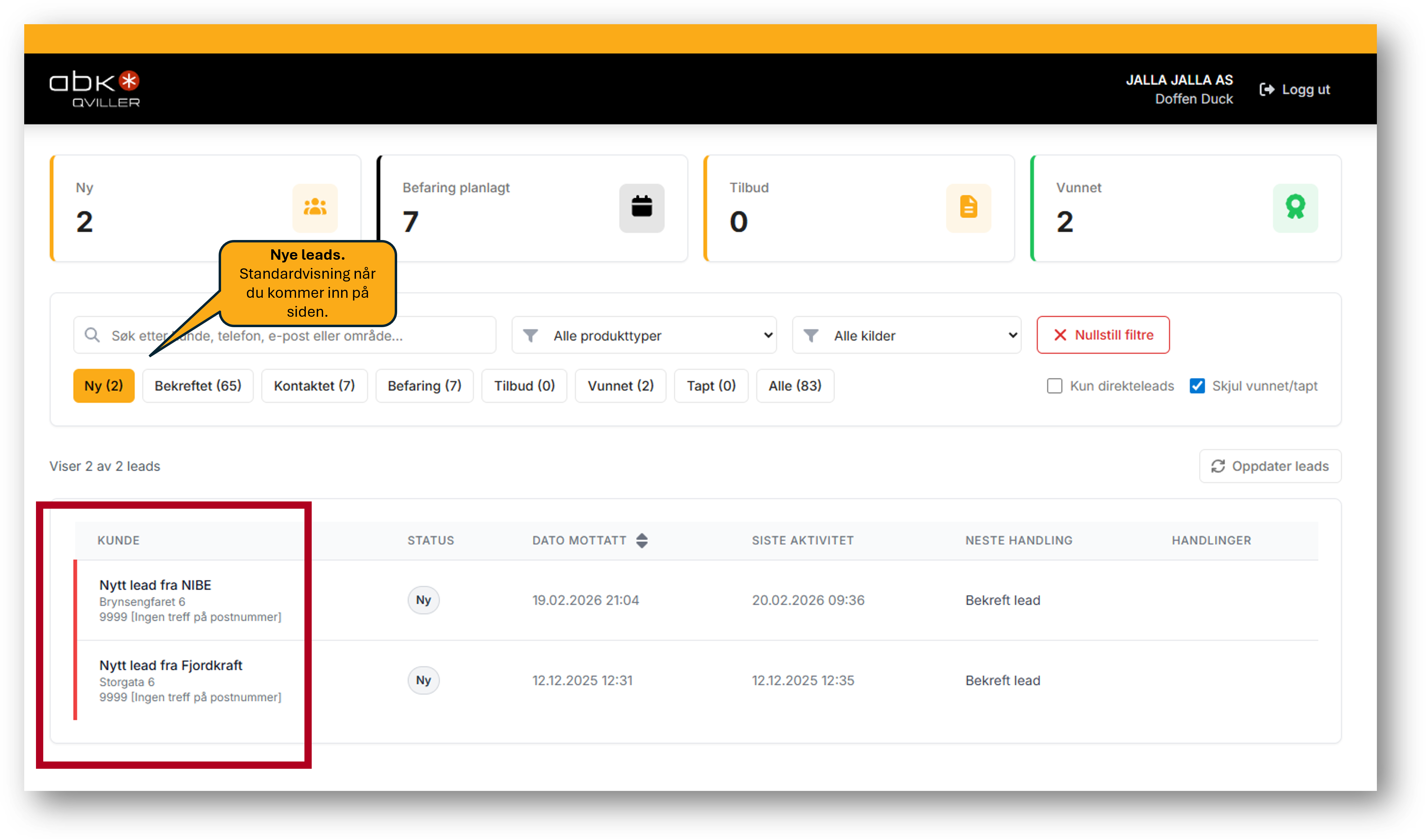 Når du åpner Leadsoversikten, kommer du først til "Ny". Her vises Leads som ikke er bekreftet enda.