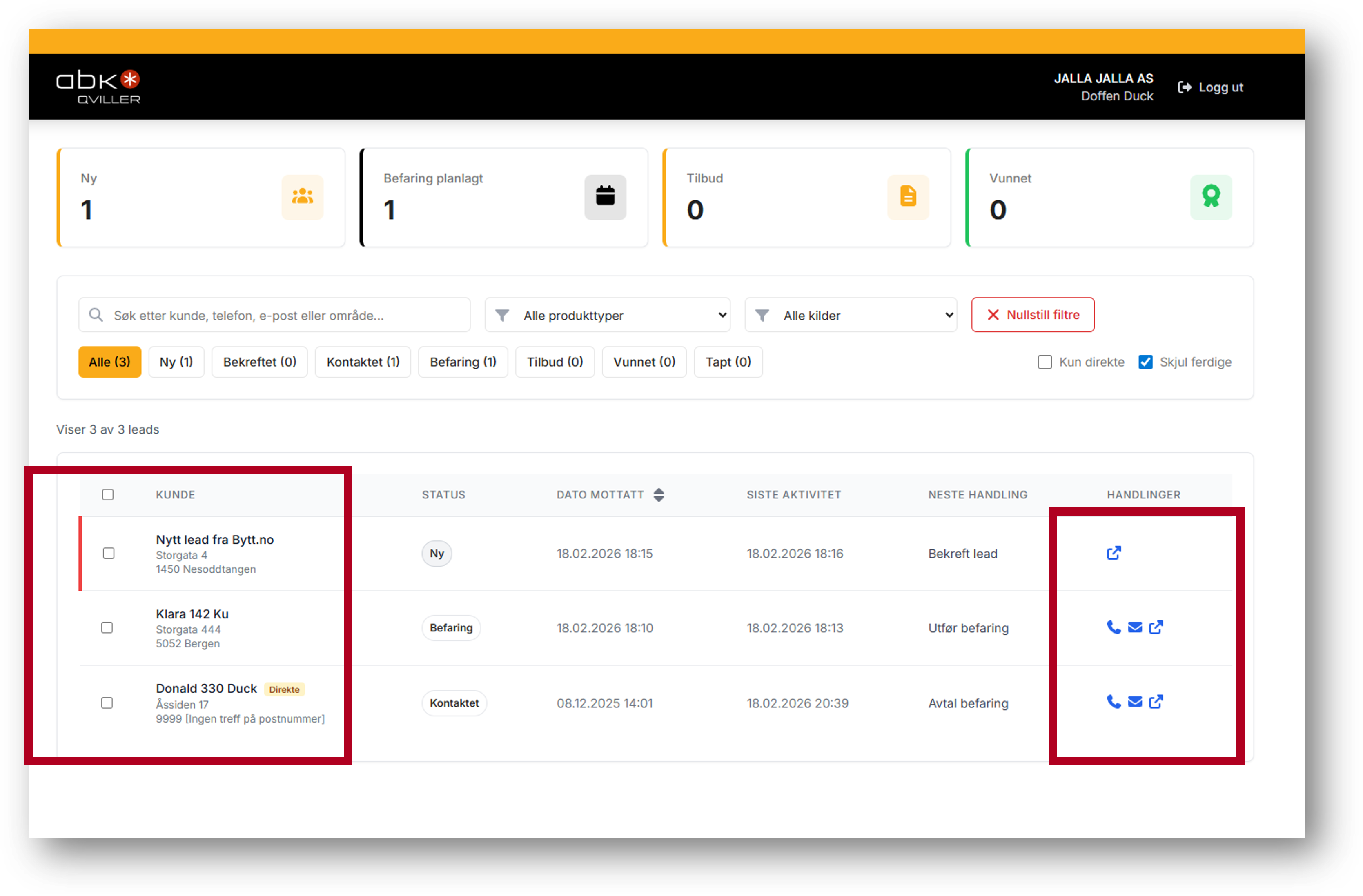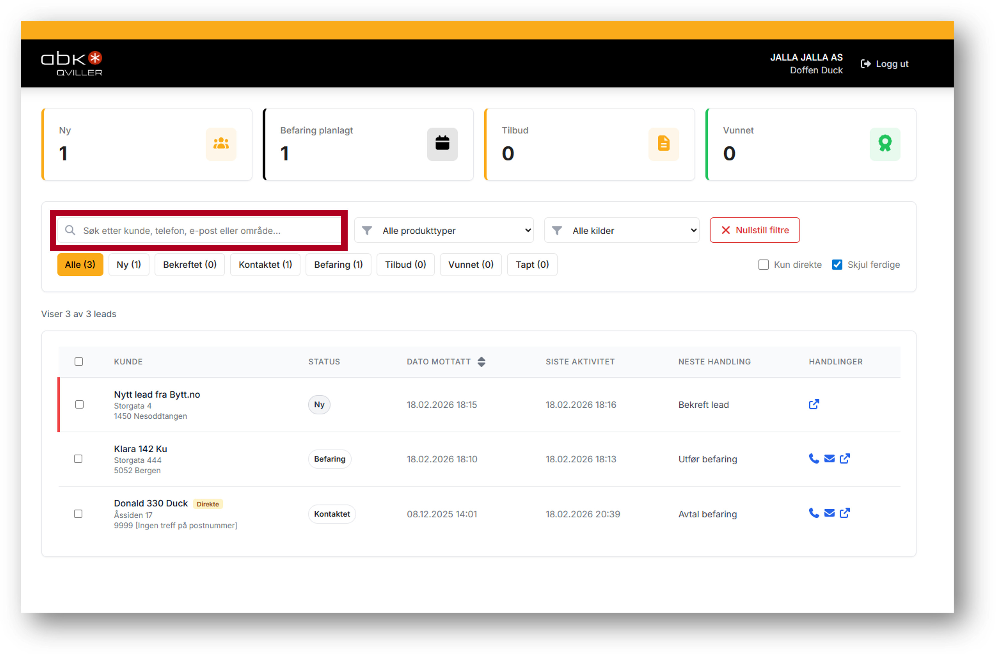 Etter at du har logget inn, kommer du til din Leadsoversikt.